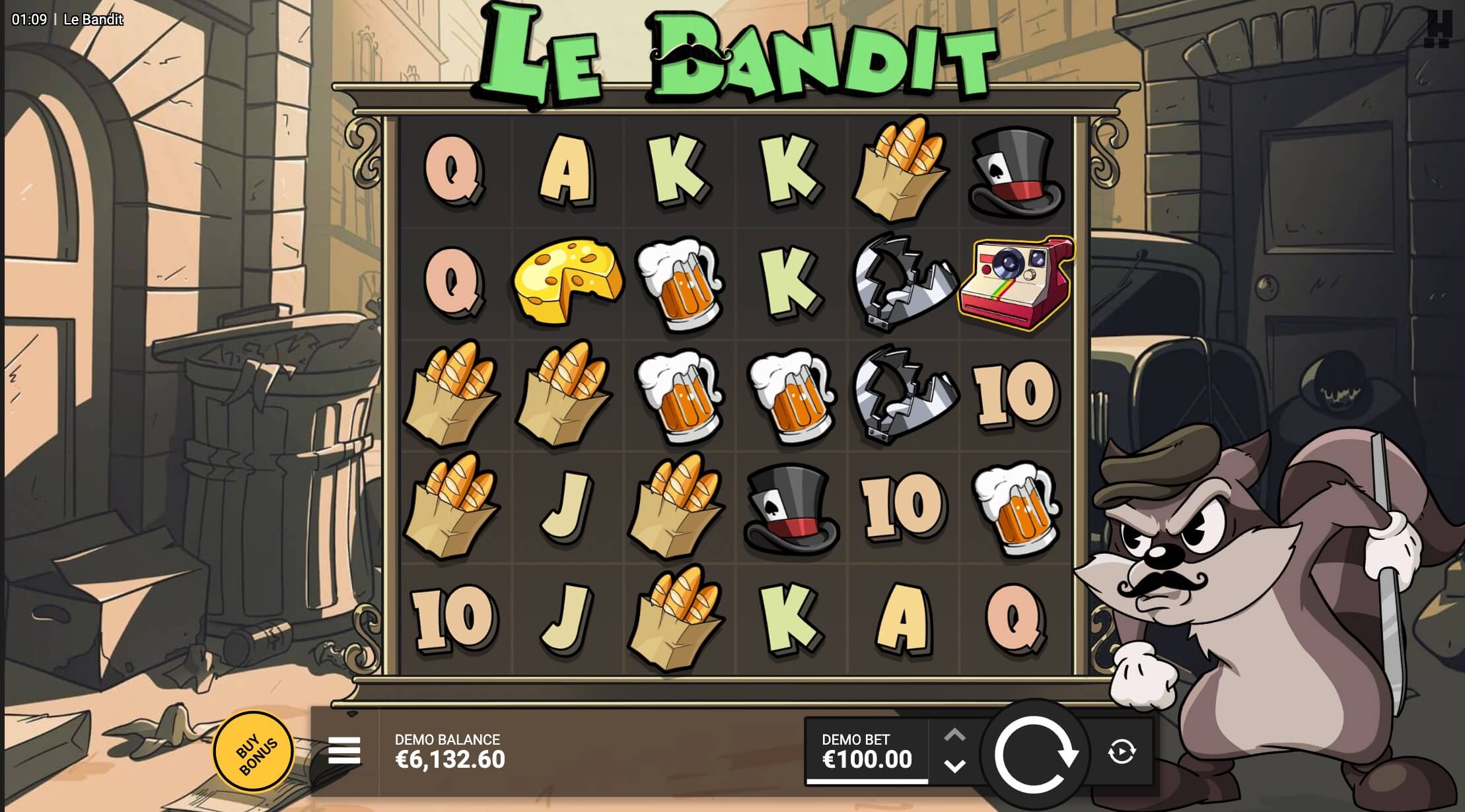 Basspelet i Le Bandit utspelar sig på en sepia-upplyst, skräpbeströdd fransk bakgata där fredlösa som Smokey gillar att promenera. Smokey Le Bandit är inte en av de mest vänliga spelmaskoter som vi faktiskt har stött på hans kofot, mustasch och argt knutna nävar, men han muntrar upp när förmånen inkluderar land.